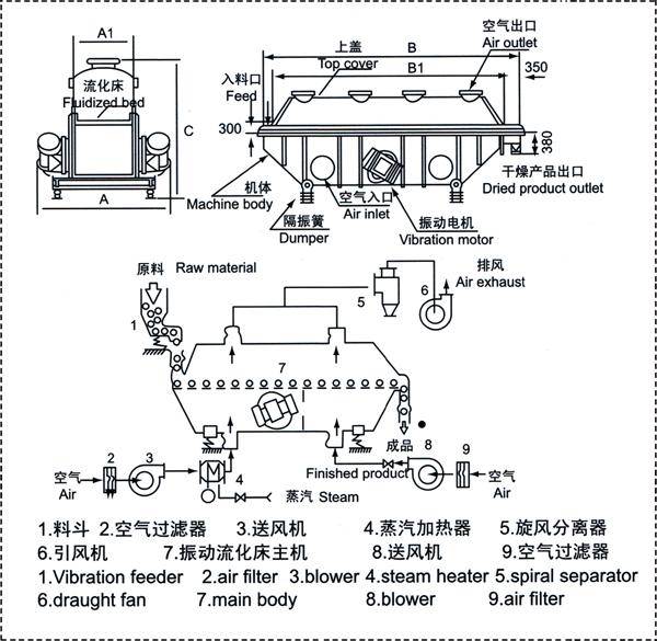 振動源采用振動電機驅動,運轉平穩,維修方便,噪音低,壽命長。流態化勻稱,無死空隙和吹穿現象,可以獲得均勻的干燥、冷卻制品。可調性好,適應面寬。料層厚度和機內移動速度以及全振幅變更均可實現無極調節。對物料表面的損傷小,可用于易碎物料的干燥,物料顆粒不規則時亦不影響工作效果。采用全封閉式的結構,有效地防止了物料與空氣間空叉感染,作業環境清潔。機械效率與熱效率高,節能效果好,比一般干燥裝置可節能30%-60%。