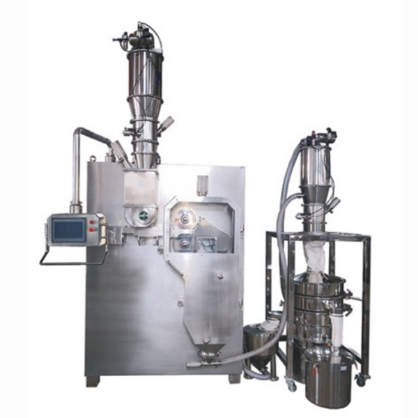 干法制粒是將經(jīng)配料混合好的干粉物料,由專用加料機(jī)(氣動(dòng)或機(jī)動(dòng))加入到上料斗內(nèi),經(jīng)螺旋輸送器輸送到壓力室,兩個(gè)高壓力擠壓輪將物料壓制成高密度薄片,通過切制系統(tǒng)切制成小塊,經(jīng)由兩級整粒系統(tǒng)制成要求大小的顆粒,完成制粒過程。