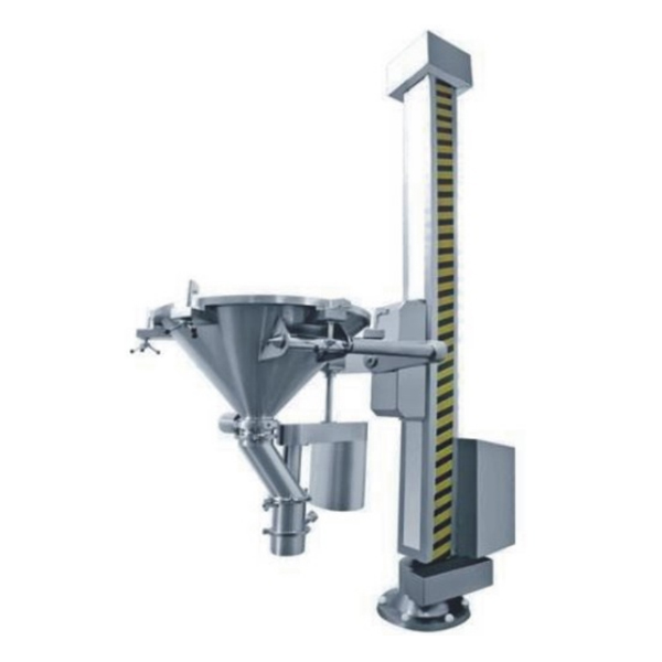 該機由NTF固定提升轉料機和ZL整粒機組成。工作時,將錐形料斗與沸騰制粒機或沸騰干燥機的料倉扣合。啟動提升按鈕,料倉提升;啟動翻轉按鈕,料倉即可翻轉180°。松開剎車,水平旋轉立柱到工藝要求位置,再下降料倉到工作高度,開啟整粒機,打開蝶閥,使物料經過整粒后密閉轉移到下一工序。