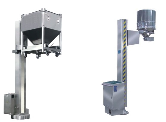 該機由底盤、立柱、提升系統等部件組成。工作時,先將裝有物料的料斗推進料斗提升機的提升叉架上。然后啟動提升按鈕,料斗做提升運動,料斗到位后轉動底盤與加料的設備密閉對接,開啟出料蝶閥,使物料密閉轉移到下一工序。